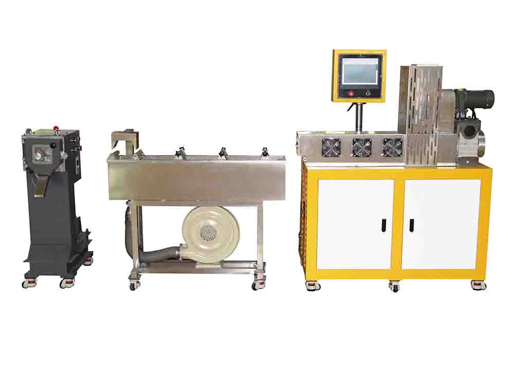 本機主要由主驅(qū)動電機、傳動裝置、擠出裝置、加料斗、電控系統(tǒng)、模頭等組成.其工作原理為:物流從料斗里放入經(jīng)過擠出裝置的塑化和擠出變?yōu)榱餮訝顟B(tài),再從主機經(jīng)模頭出來,擠出機組的用途不同其選配用的輔助設(shè)備也不盡相同。